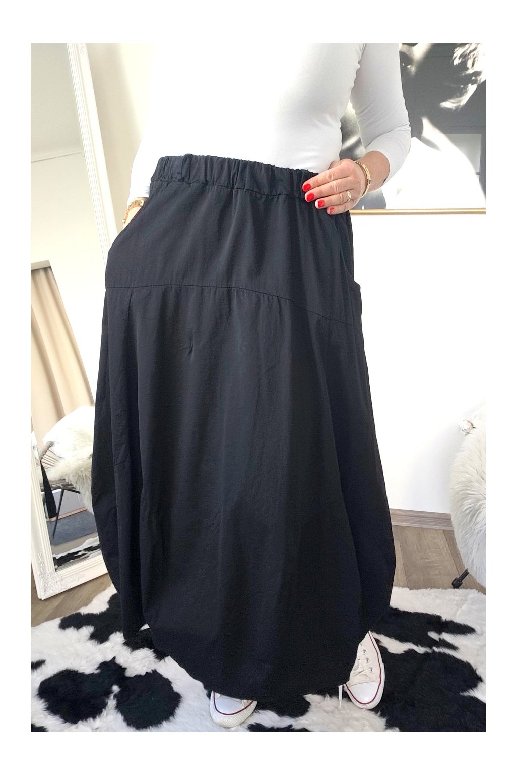 Sukně má pružný pas, který se přizpůsobí vaší postavě. Sukně má dvě boční kapsy, do kterých