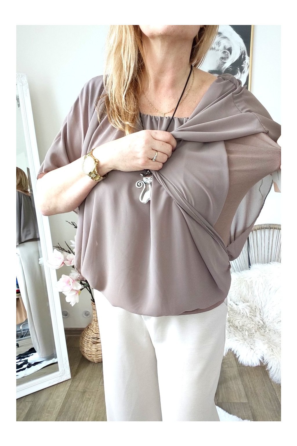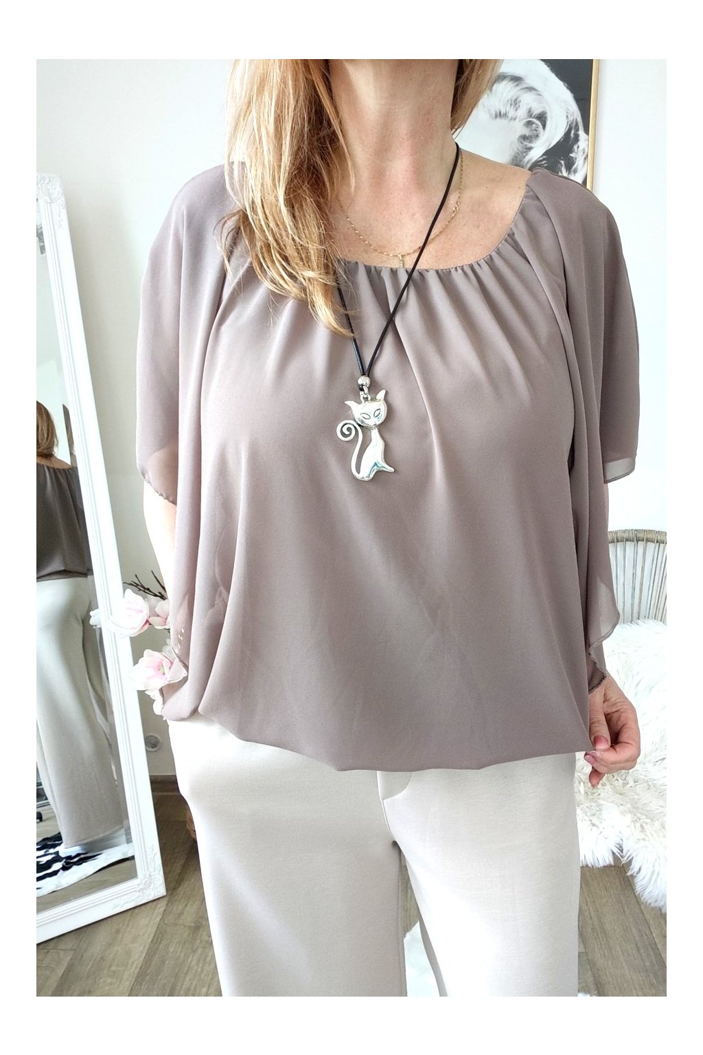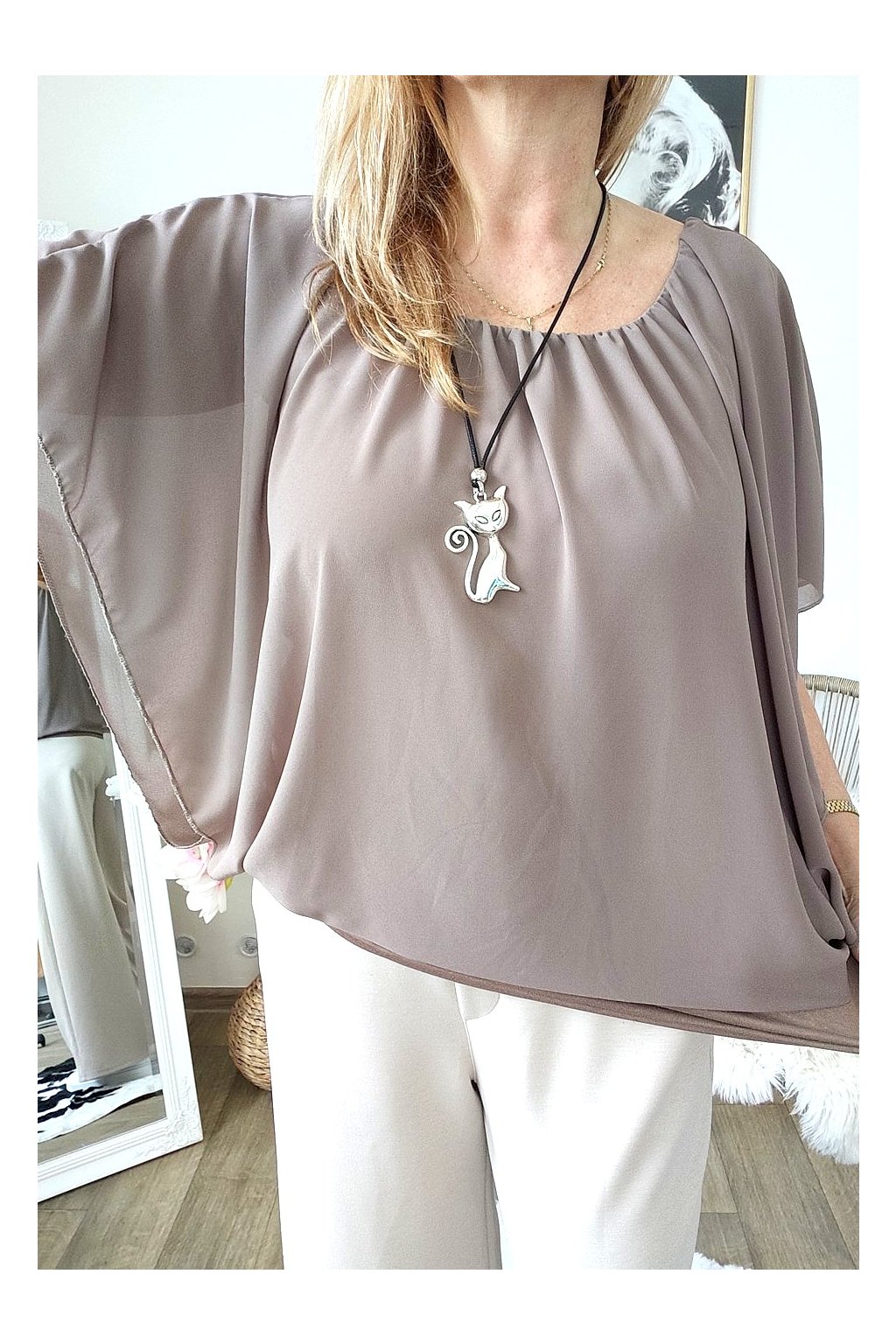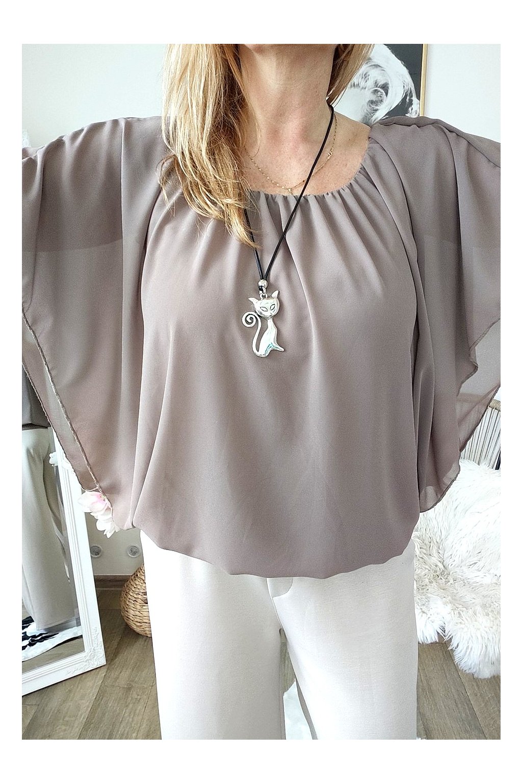 topu a vrchní lehké šifonové vrstvy, která vytváří netopýří rukávy.