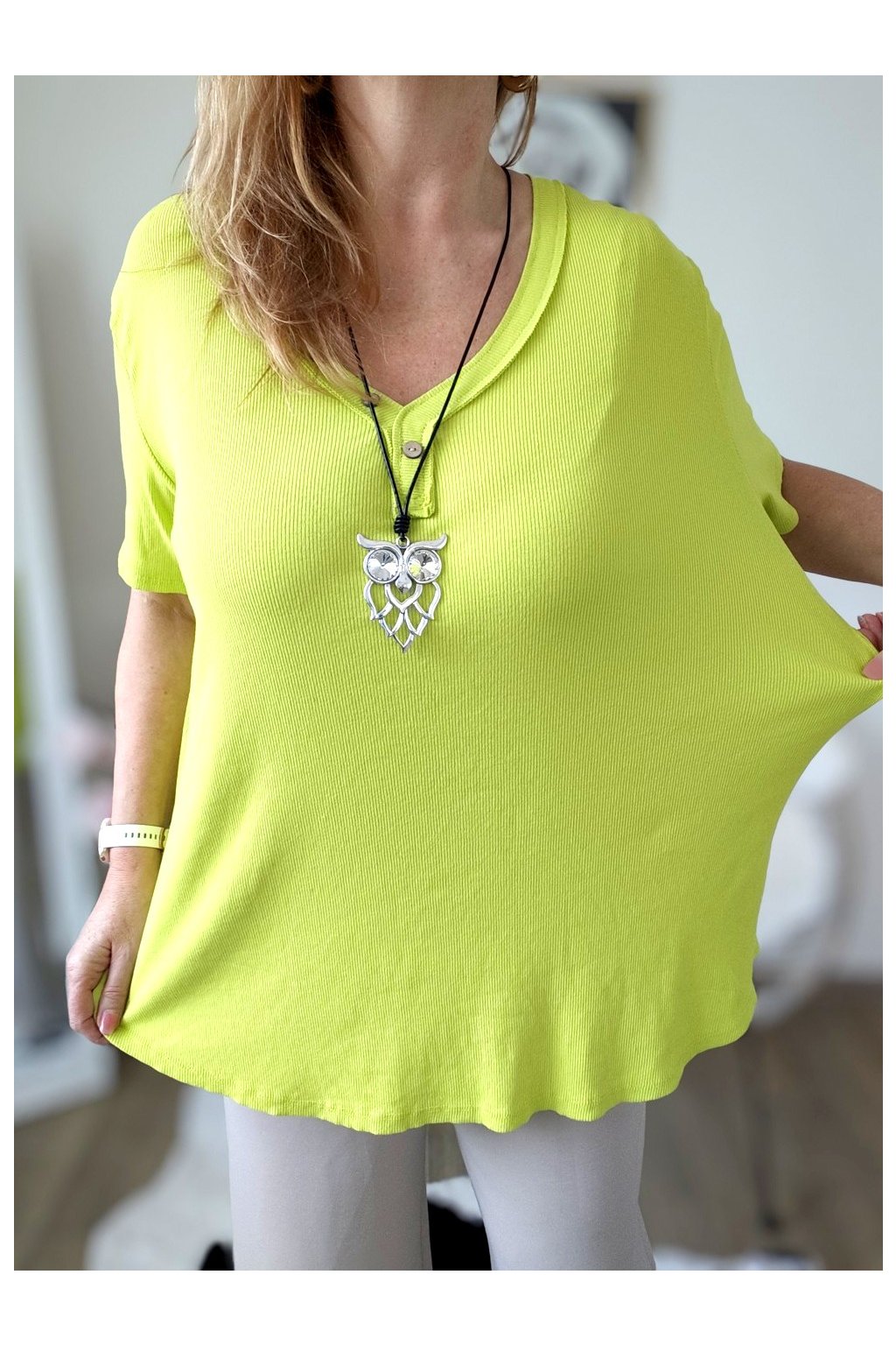 Výstřih do V je doplněn dekorativními knoflíčky, které tričku dodávají