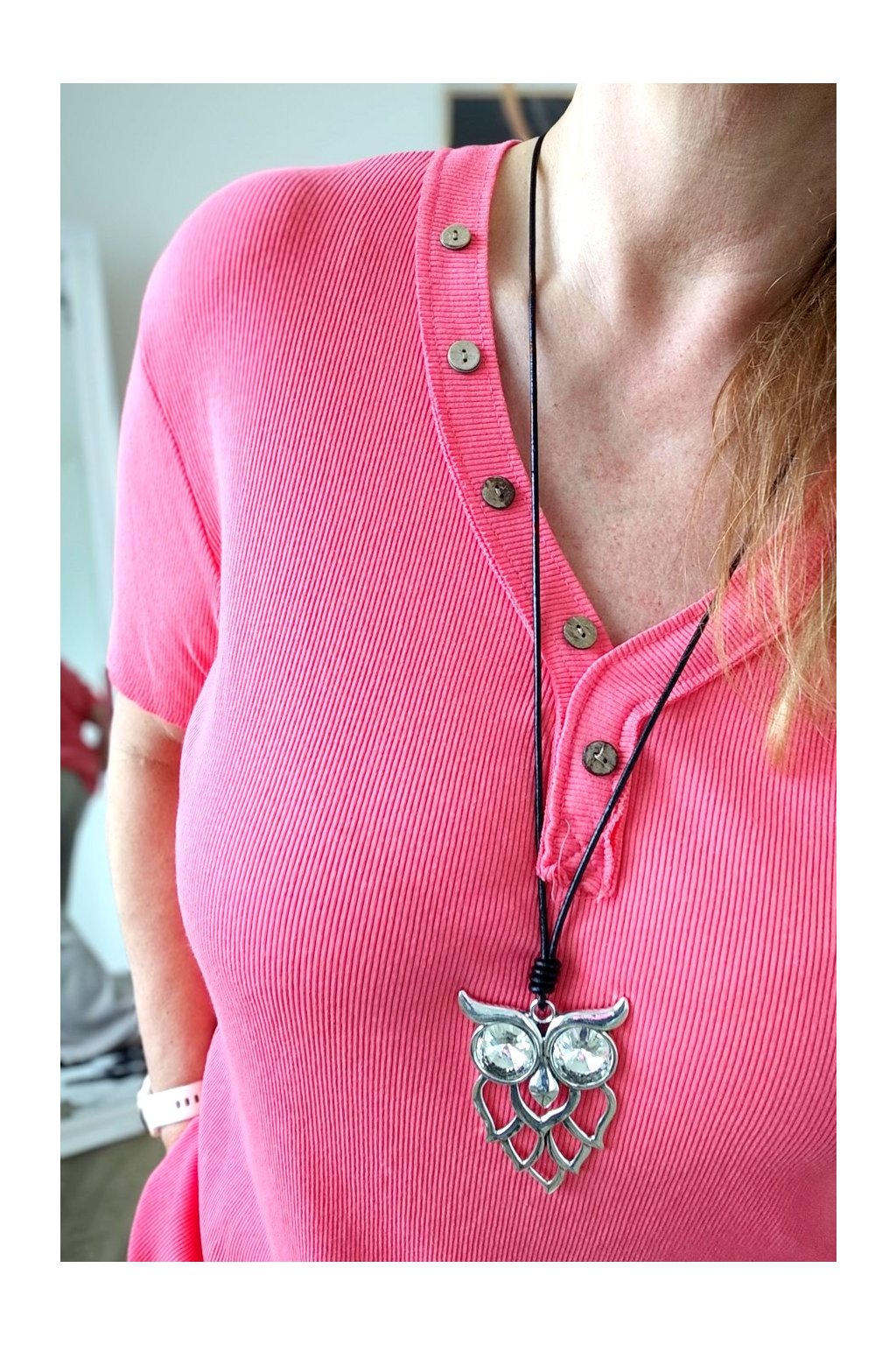 Výstřih do V je doplněn dekorativními knoflíčky, které tričku dodávají