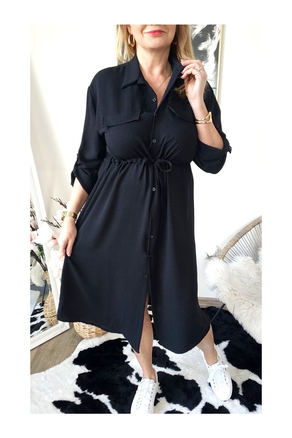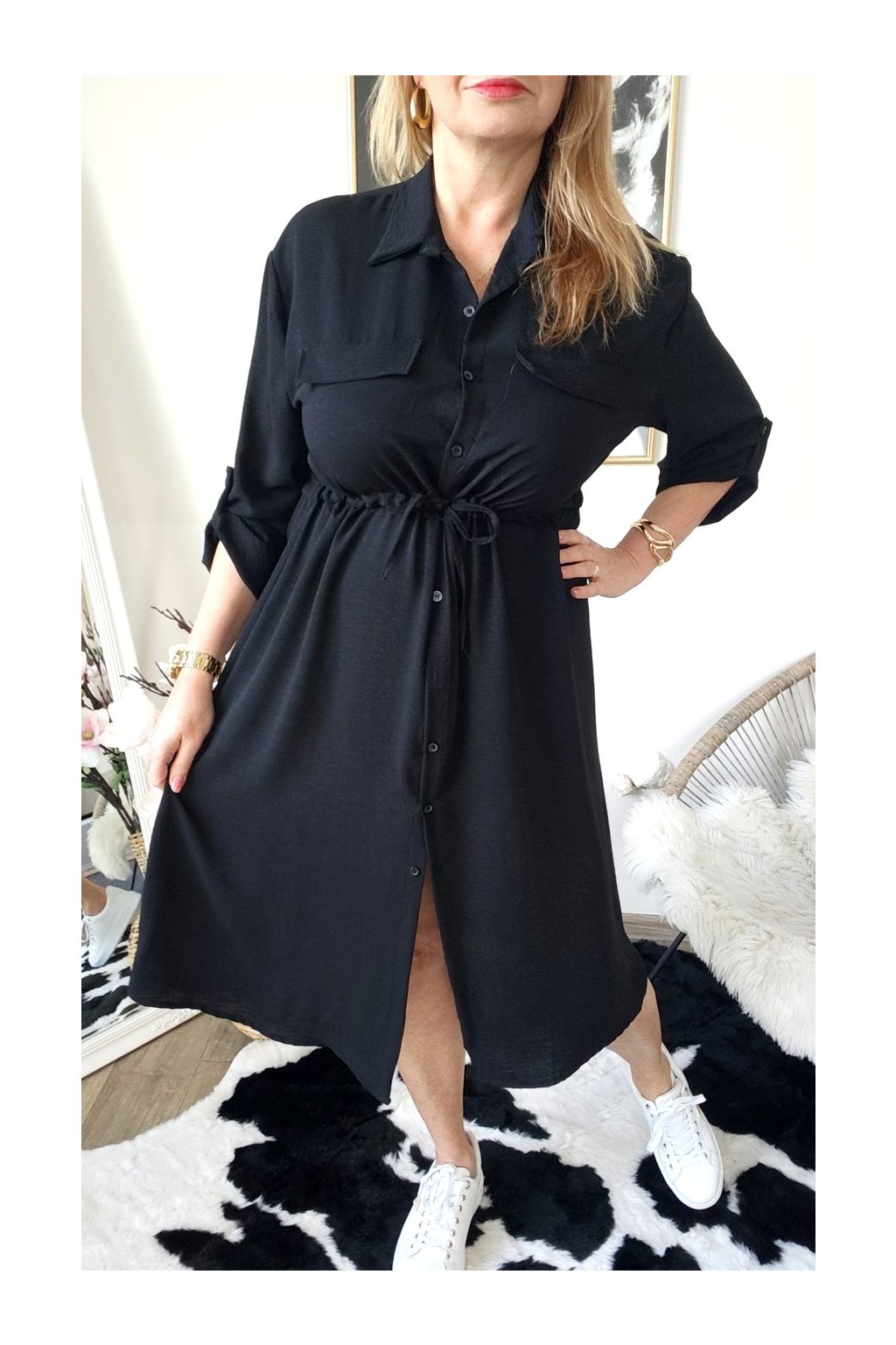 Šaty jsou celopropínací, disponují stahováním v pase na šňůrku,