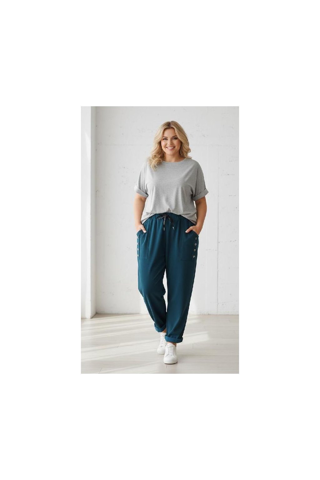 Ozdobné knoflíky, kapsy, v pase guma + šňůrka