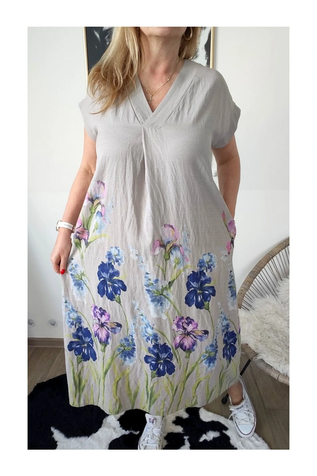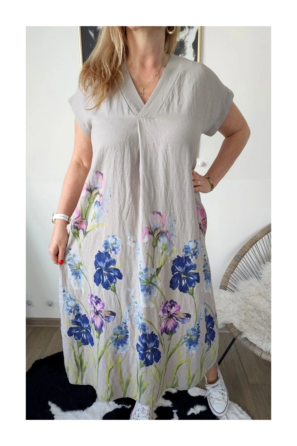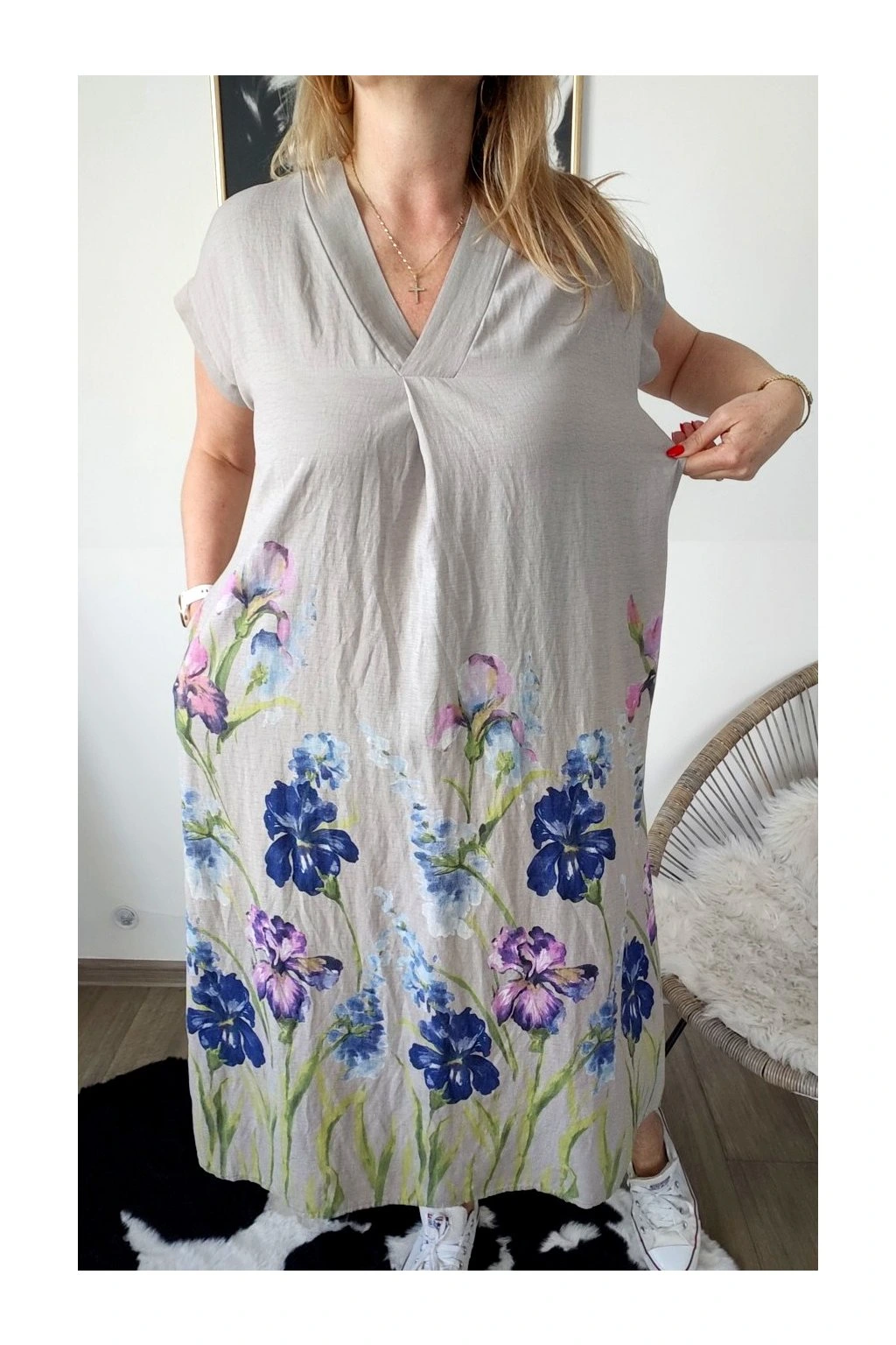 Spodní lem zdobí velkorysé květy květů. Oversize provedení s "V" výstřihem sedne téměř každé postavě.