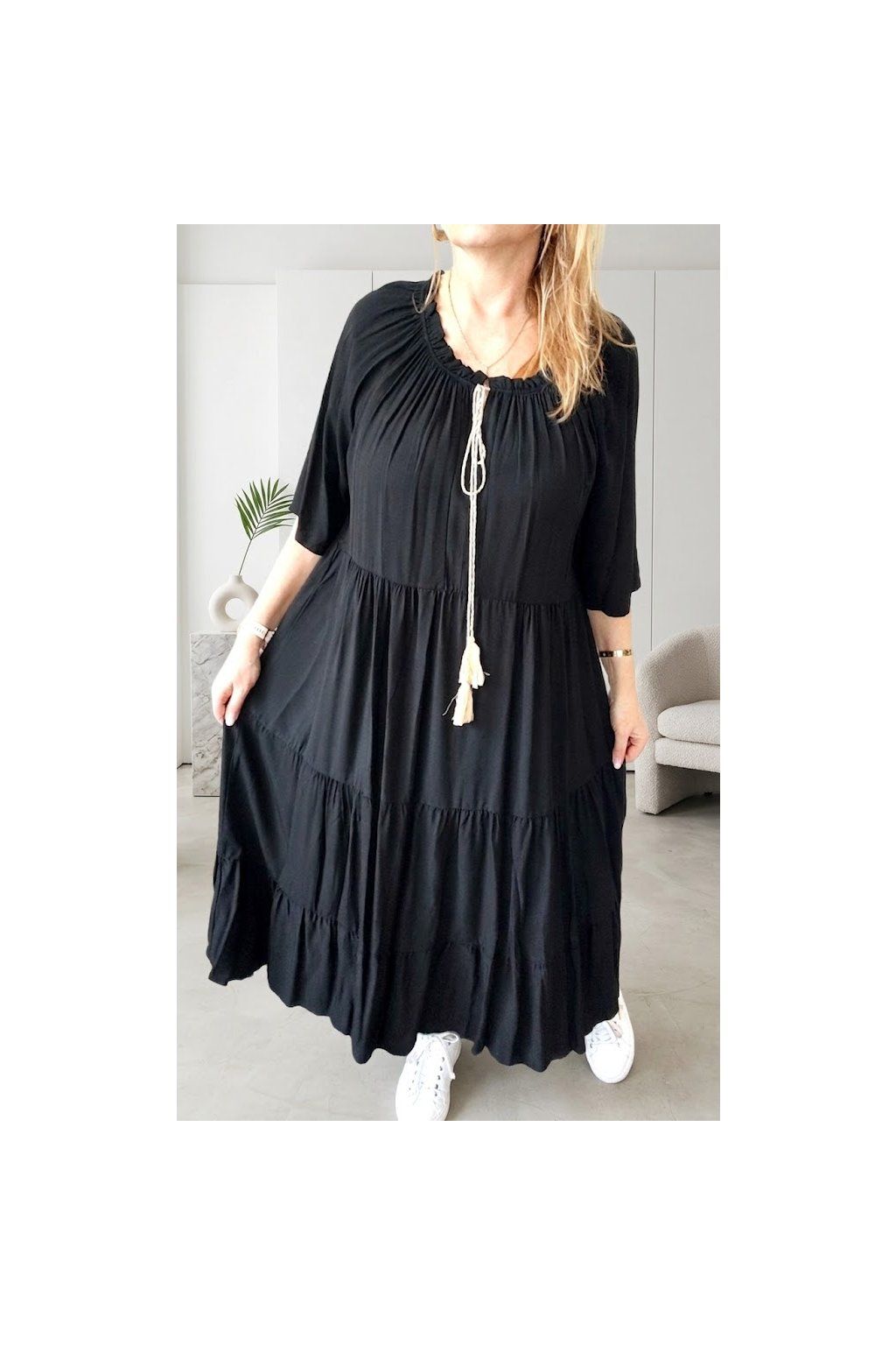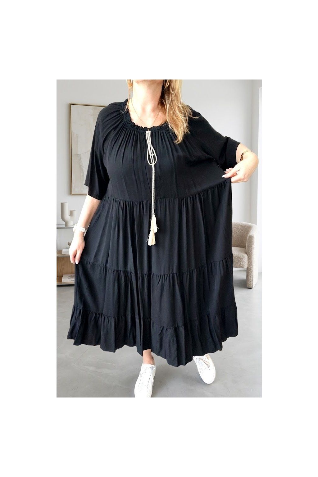 Dopřejte si pocit svobody a nekonečného pohodlí s našimi stupňovitými maxi šaty. Tento model je definicí ležérní elegance.