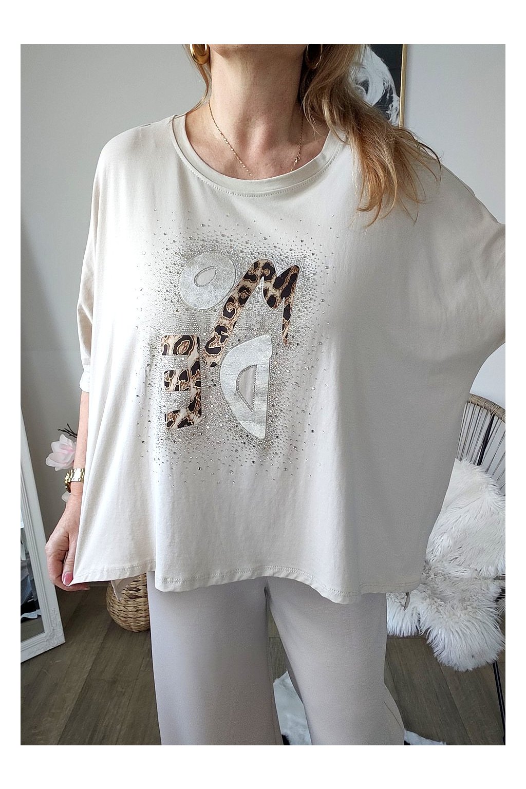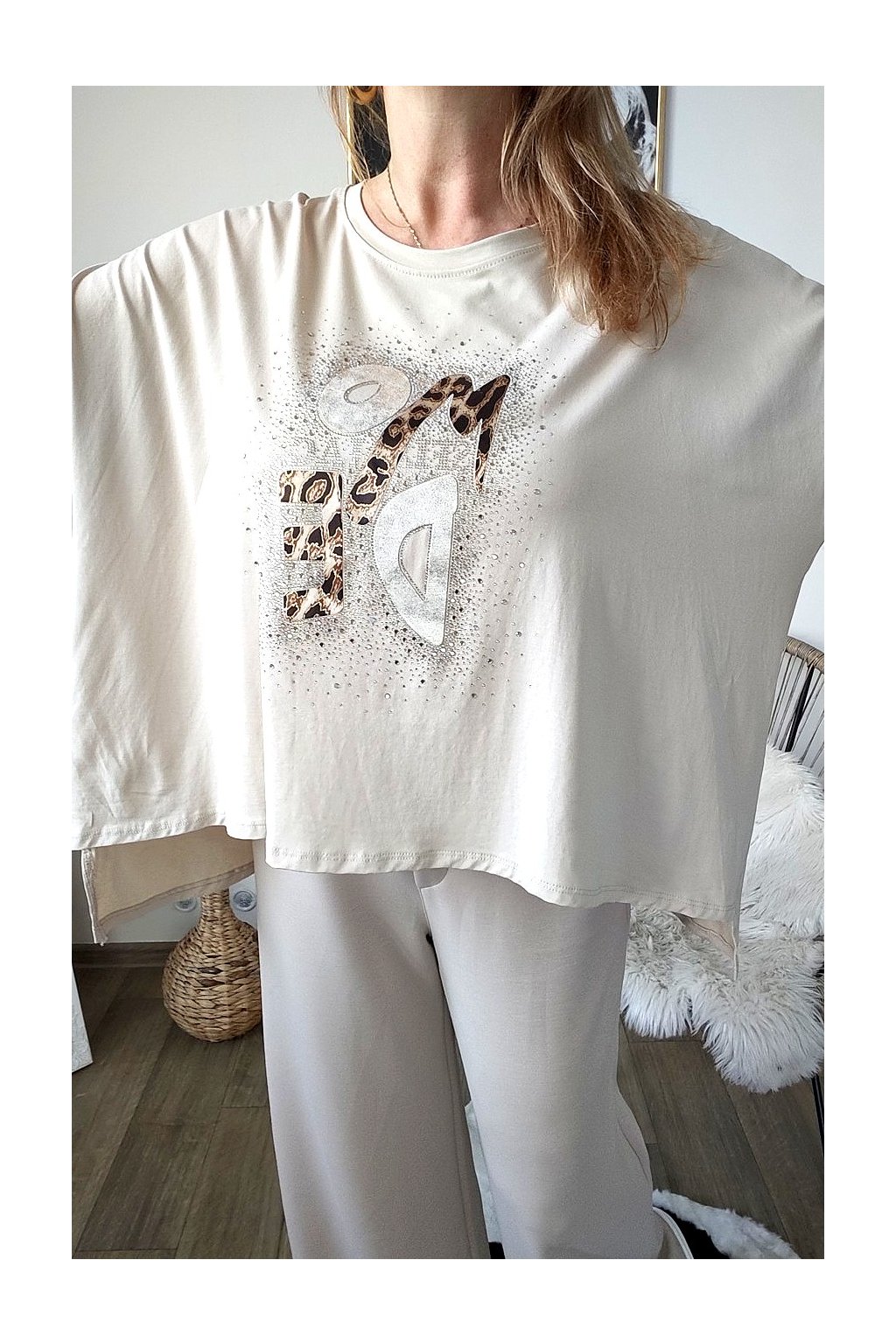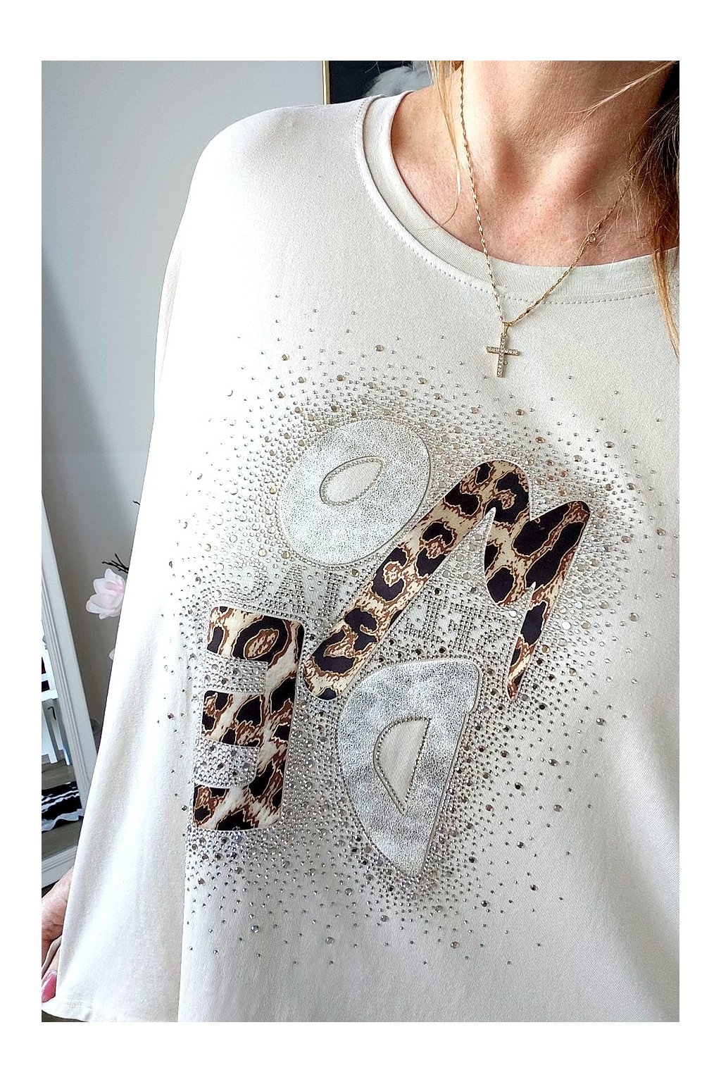Přední stranu zdobí stylový nápis s leopardím vzorem a jemnými kamínky,