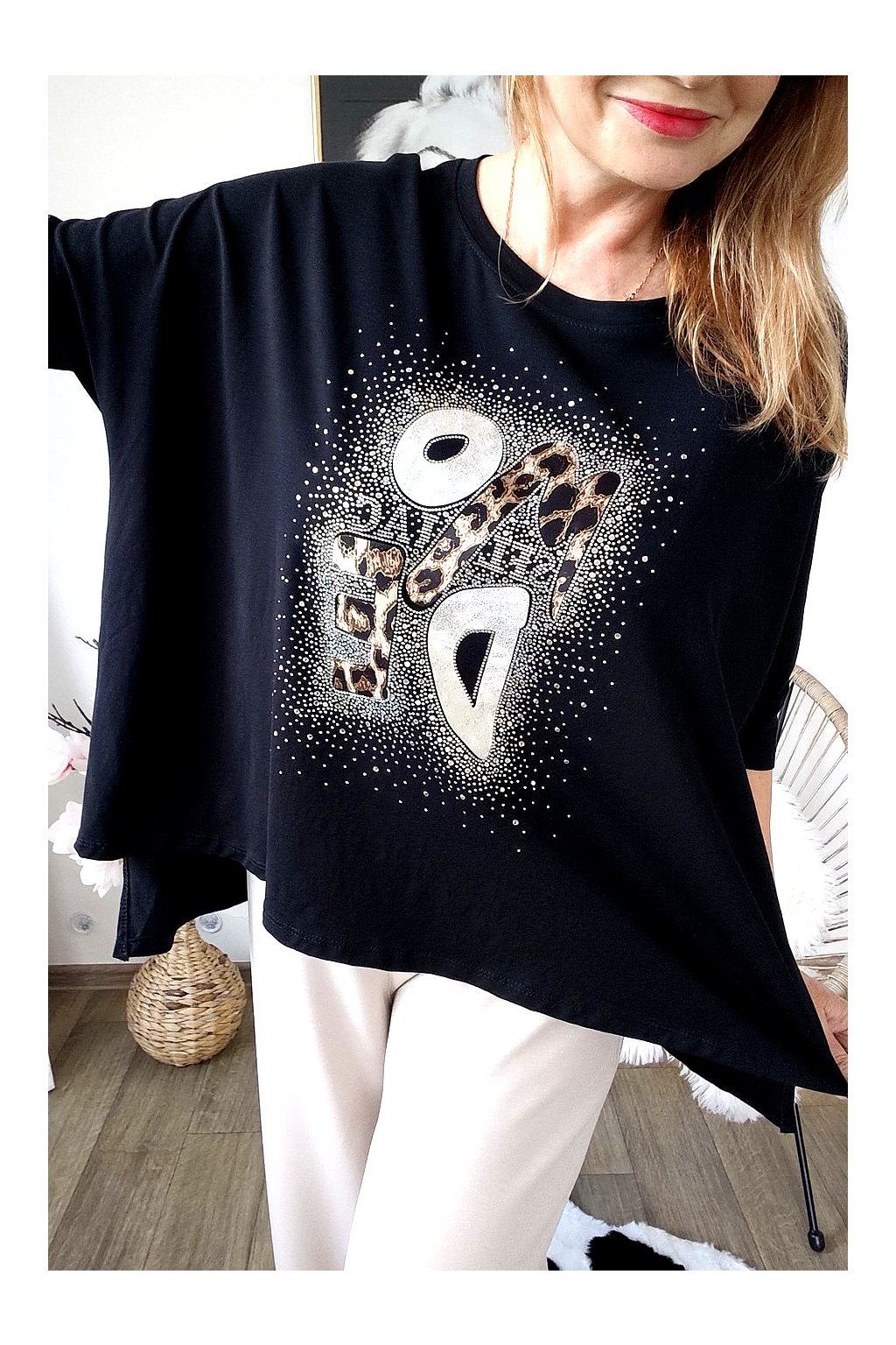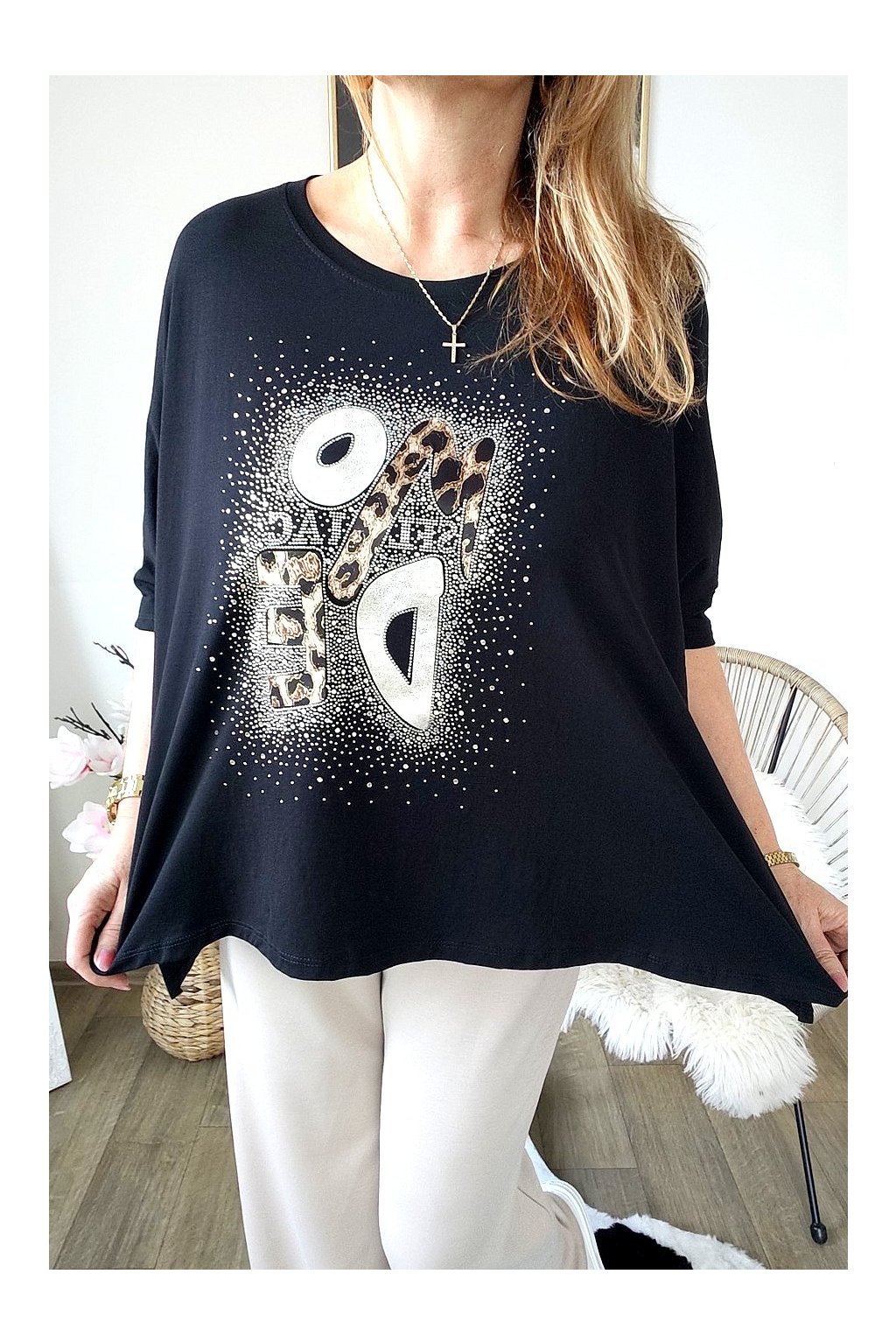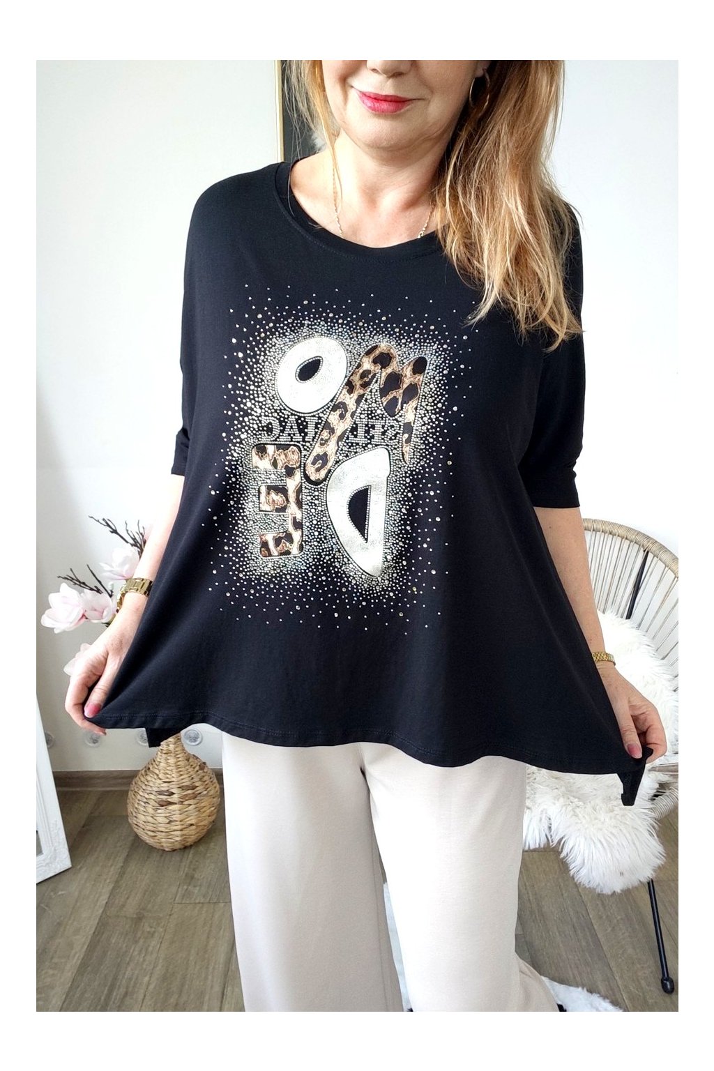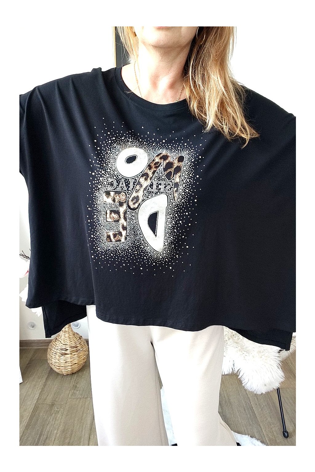 Přední stranu zdobí stylový nápis s leopardím vzorem a jemnými kamínky,