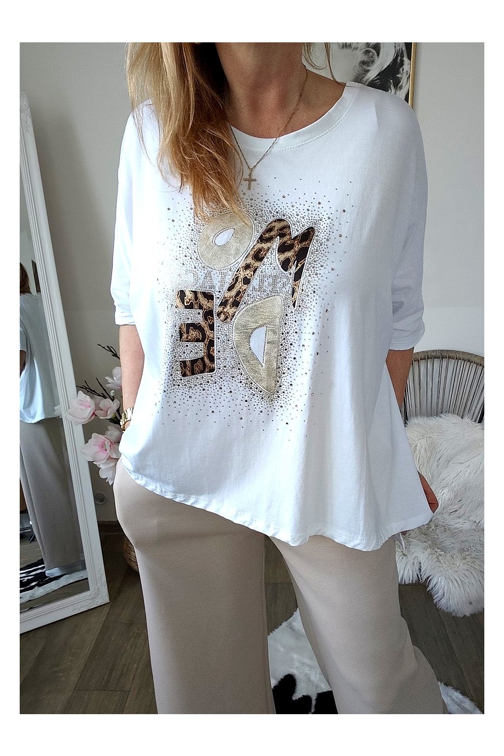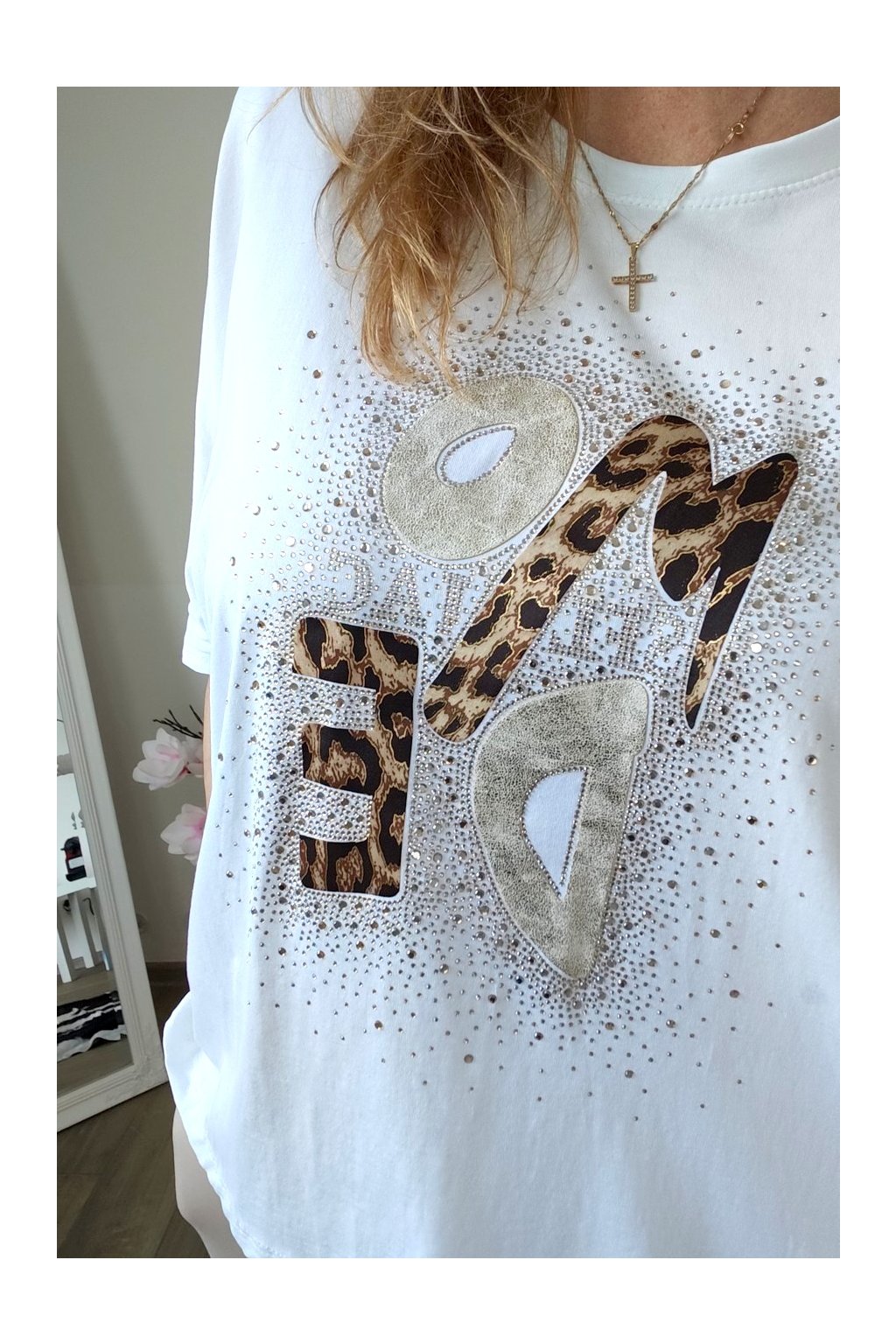Přední stranu zdobí stylový nápis s leopardím vzorem a jemnými kamínky,