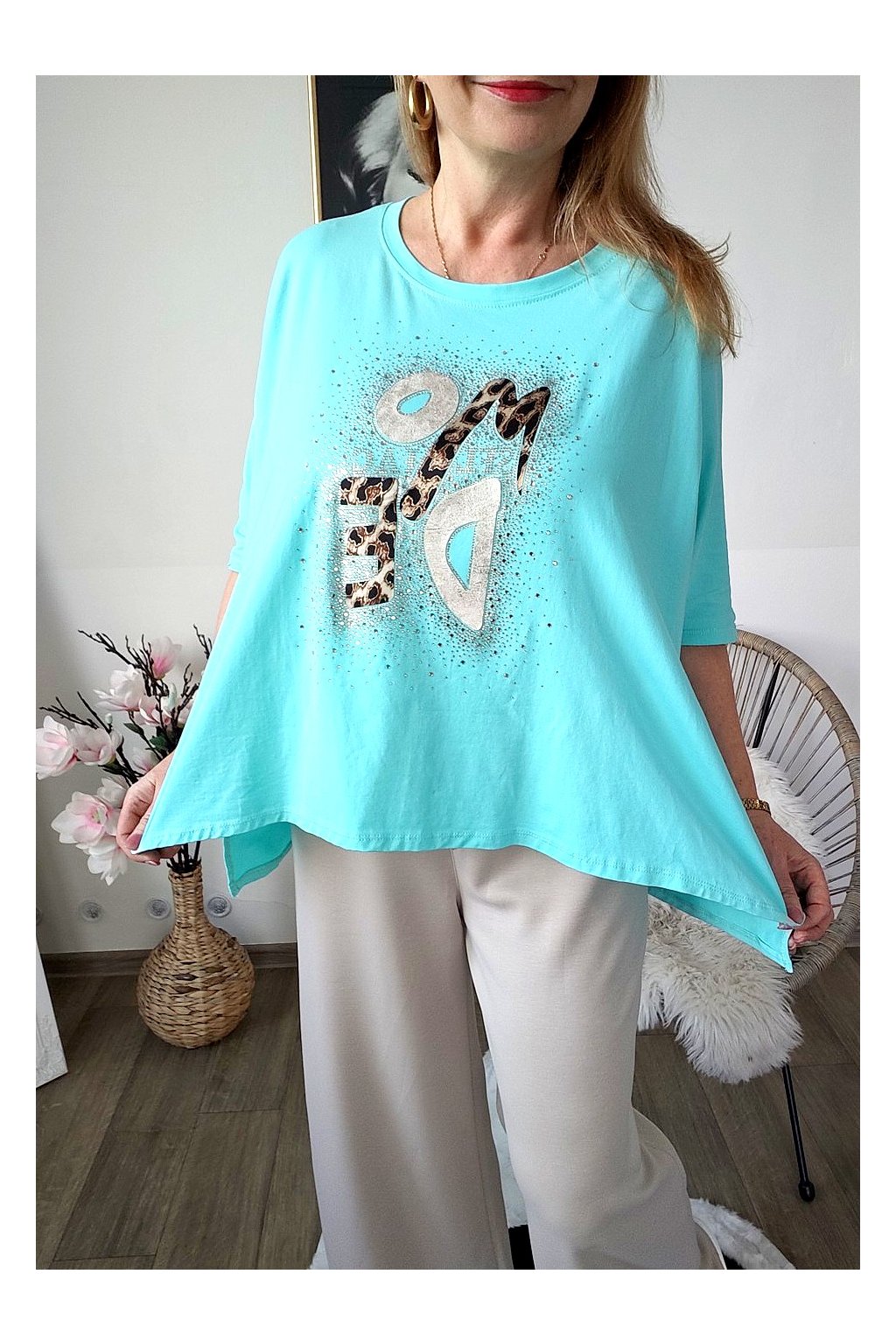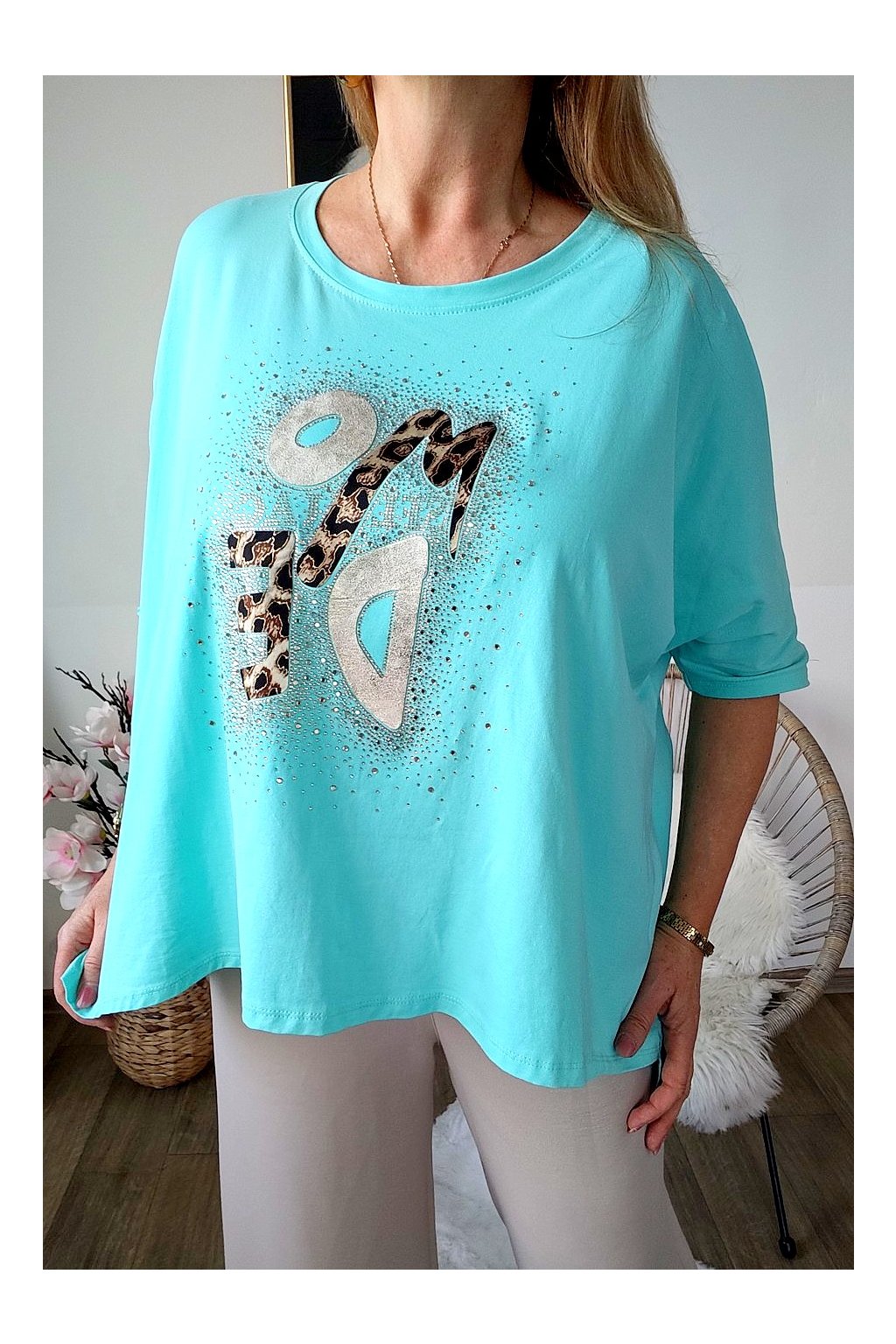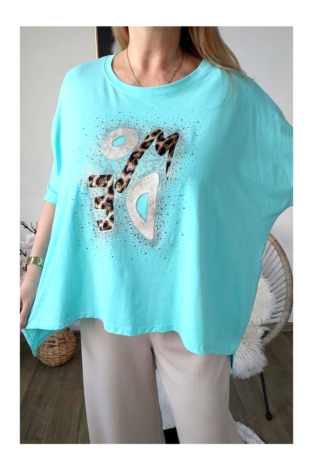 Přední stranu zdobí stylový nápis s leopardím vzorem a jemnými kamínky,