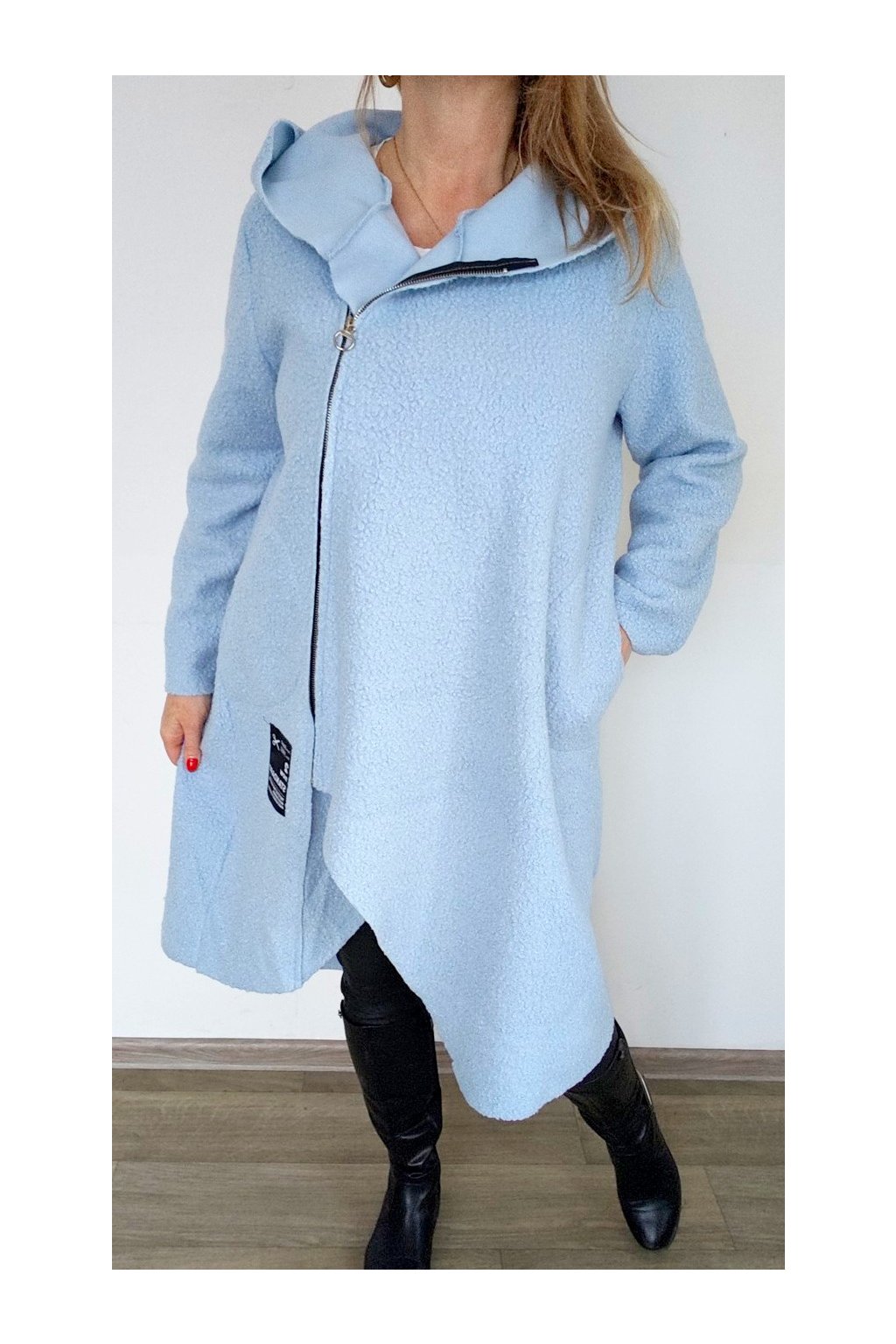 Nášivky, kapsy, asymetrický zip, kapuce, nemá podšívku