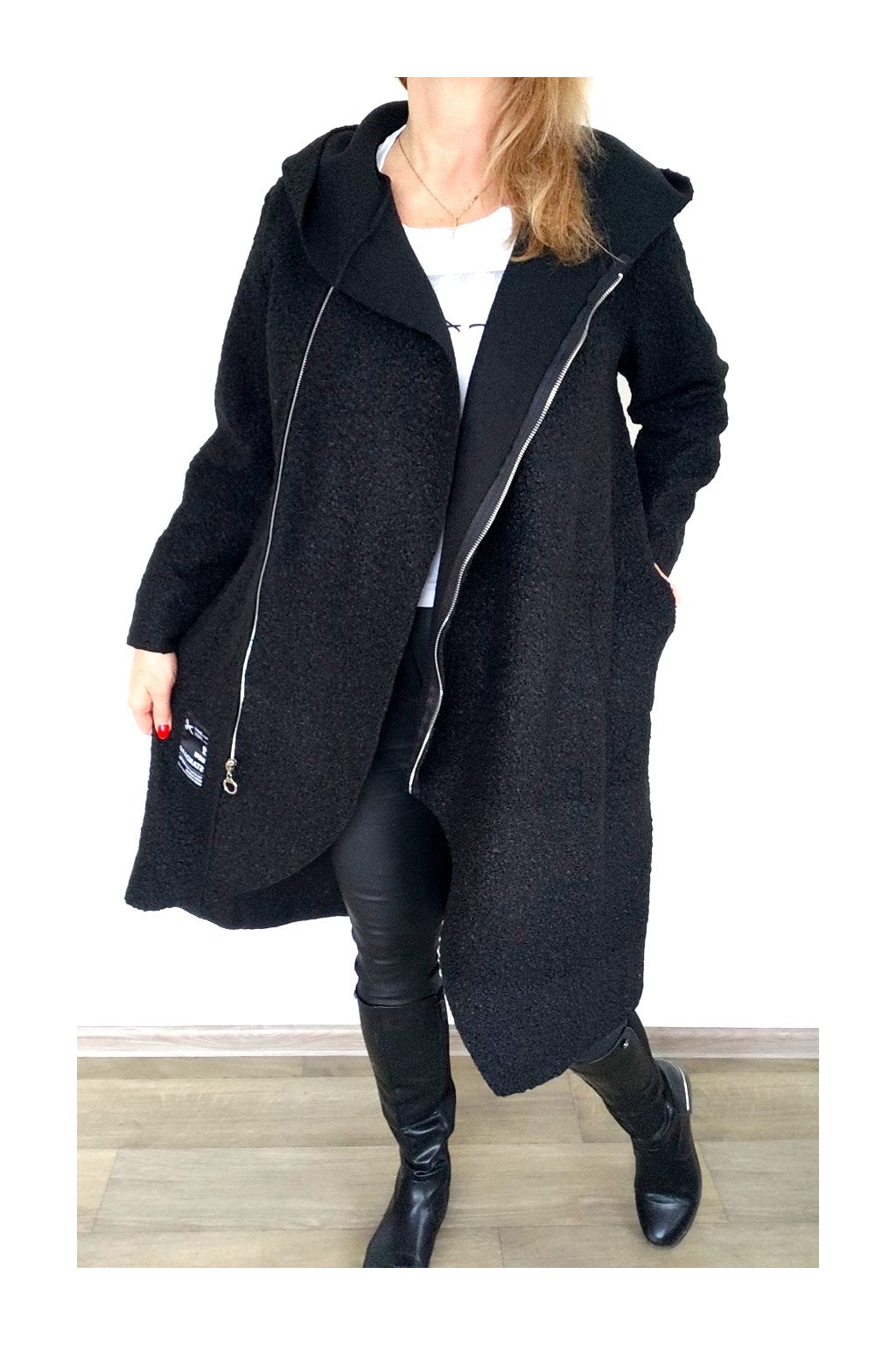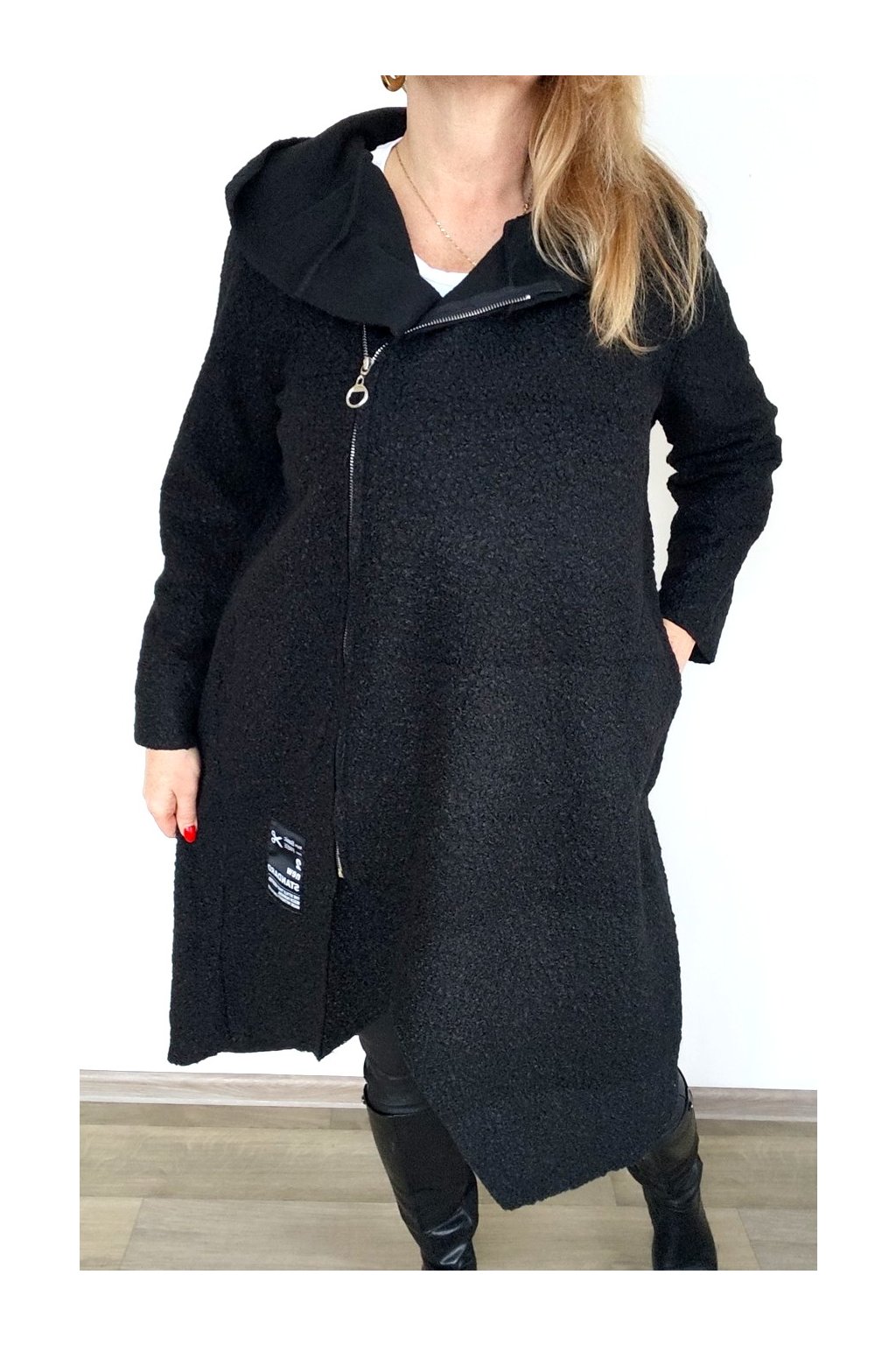 Nášivky, kapsy, asymetrický zip, kapuce, nemá podšívku
